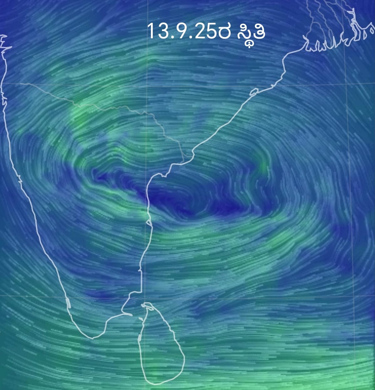ಸೆಪ್ಟೆಂಬರ್ 13ರಂದು ಬಂಗಾಳಕೊಲ್ಲಿಯ ಆಂದ್ರಾ ಕರಾವಳಿಯಲ್ಲಿ ವಾಯುಭಾರ ಕುಸಿತದಂತಹ ತಿರುಗುವಿಕೆ ಉಂಟಾಗುವ ಸಾಧ್ಯತೆಗಳಿದ್ದು, ಇದರ ಪರಿಣಾಮದಿಂದ ರಾಜ್ಯದ ಉತ್ತರ, ಹಾಗೂ ಒಳನಾಡು ಭಾಗಗಳಲ್ಲಿ ಅಲ್ಲಲ್ಲಿ ಗುಡುಗು ಸಹಿತ ಮಳೆಯಾಗುವ ಸೂಚನೆಗಳಿವೆ