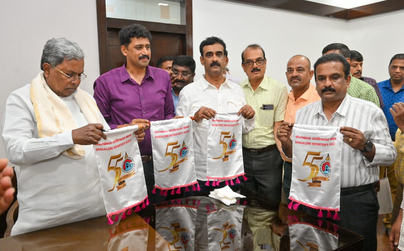 ಮುಖ್ಯಮಂತ್ರಿ ಸಿದ್ದರಾಮಯ್ಯ ಅವರು, ಬೆಂಗಳೂರು ವರದಿಗಾರರ ಕೂಟದ ಸುವರ್ಣ ಮಹೋತ್ಸವ-55 ಲಾಂಛನವನ್ನು ಗುರವಾರ ಕೃಷ್ಣದಲ್ಲಿ ಬಿಡುಗಡೆ ಮಾಡಿದರು.