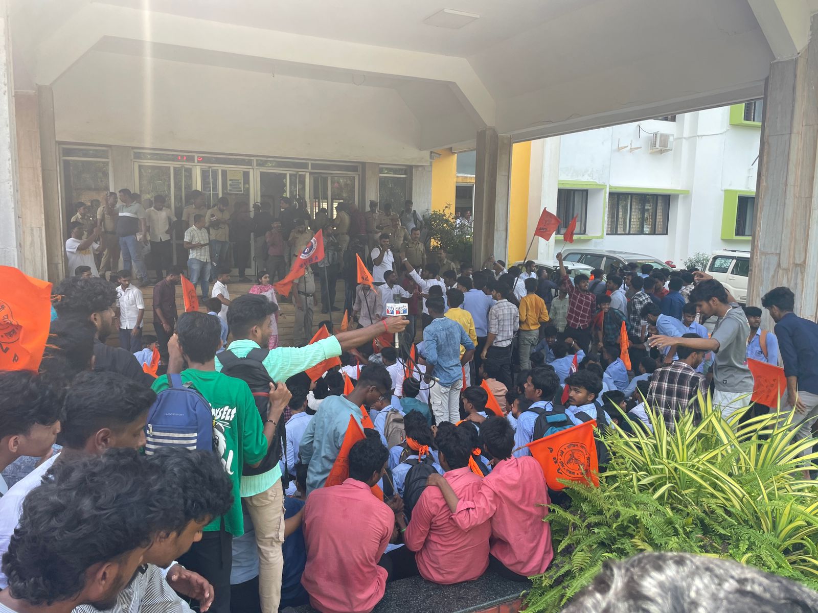 ದಕ್ಷಿಣ ಕನ್ನಡ ಜಿಲ್ಲೆಯ ವಿವಿಧ ಕಾಲೇಜುಗಳಿಂದ ಪ್ರತಿಭಟನೆಗೆ ಆಗಮಿಸಿದ ವಿದ್ಯಾರ್ಥಿಗಳು ಮಂಗಳೂರು ವಿಶ್ವವಿದ್ಯಾಲಯದ ಕುಲಪತಿಗಳ ಕಚೇರಿಗೆ ಮುತ್ತಿಗೆ ಹಾಕಲು ಬಸ್ ಮೂಲಕ ತಂಡೋಪತಂಡವಾಗಿ ತೆರಳಿದರು. ವಿದ್ಯಾರ್ಥಿಗಳನ್ನು ವಿ.ವಿ. ಆಡಳಿತ ಕಚೇರಿ ಬಳಿ ಬ್ಯಾರಿಕೇಡ್ ಹಾಕಿ ತಡೆಹಿಡಿಯಲಾಗಿತ್ತು. ಆರಂಭದಲ್ಲಿ ಕಚೇರಿ ಎದುರಿನ ರಸ್ತೆಯಲ್ಲಿ ಘೋಷಣೆಗಳನ್ನು ಕೂಗಿದ ವಿದ್ಯಾರ್ಥಿಗಳು ಬಳಿಕ ಬ್ಯಾರಿಕೇಡ್ ತಳ್ಳಿ ಒಳ ನುಗ್ಗಿದರು. ಆಡಳಿತ ಕಚೇರಿಯ ಒಳಗೆ ನುಗ್ಗಲು ಪ್ರಯತ್ನಿಸಿದ ಸಂದರ್ಭ ವಿದ್ಯಾರ್ಥಿಗಳು ಒಳ ಹೋಗದಂತೆ ಪೊಲೀಸರು ತಡೆಯೊಡ್ಡಿದರು. ಈ ನಡುವೆ ನೂಕಾಟ ತಳ್ಳಾಟಗಳ ಪರಿಣಾಮ ವಿ.ವಿ ಆಡಳಿತ ಕಚೇರಿಯ ಪ್ರವೇಶ ದ್ವಾರದ ಗಾಜು ಪುಡಿಯಾಗಿದೆ, ಓರ್ವ ಮಹಿಳಾ ಪೊಲೀಸ್ ಕಾನ್ಸ್ಟೇಬಲ್ ಗೆ ಗಾಯವಾಗಿದೆ. ಓರ್ವ ವಿದ್ಯಾರ್ಥಿಯ ಕೈಗೂ ತಾಗಿದೆ. ಪ್ರತಿಭಟನಾ ಸ್ಥಳಕ್ಕೆ ಆಗಮಿಸಿದ ವಿವಿ ಉಪಕುಲಪತಿ ಪಿ.ಎಲ್.ಧರ್ಮ ಆಕ್ರೋಶ ವ್ಯಕ್ತಪಡಿಸಿ