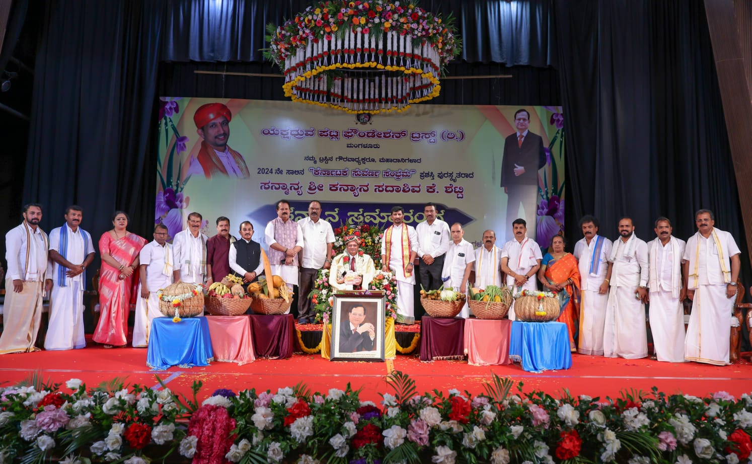 ಕನ್ಯಾನ ಸದಾಶಿವ ಶೆಟ್ಟಿ ಅವರನ್ನು ಚಂದ್ರಹಾಸ ಶೆಟ್ಟಿ ಅವರ ಪರಿಕಲ್ಪನೆಯಲ್ಲಿ ವಿನೂತನವಾಗಿ ಸನ್ಮಾನಿಸಲಾಯಿತು. ಸನ್ಮಾನದ ಪೇಟ, ಶಾಲು, ಸ್ಮರಣಿಕೆ, ತೈಲಚಿತ್ರವನ್ನೊಳಗೊಂಡ ವಸ್ತುಗಳನ್ನು ಸಭಾಂಗಣದ ಮೂಲಕ ಪಲ್ಲಕ್ಕಿಯಲ್ಲಿ ತರಲಾಯಿತು. ಜತೆಗೆ ಗೆಂದಾಳೆ ಸಿಯಾಳ, ಅಡಕೆ ಗೊನೆ, ತರಕಾರಿ, ಹಣ್ಣು ಹಂಪಲು, ಅಕ್ಕಿ ಹಾಗೂ ಭತ್ತದ ಮುಡಿ, ಹಿಂಗಾರ ಮೊದಲಾದ ಬುಟ್ಟಿಗಳನ್ನು 6 ಜತೆ ಪತಾಕೆ, ಬಣ್ಣದ ಕೊಡೆ, ಕೊಂಬು, ವಾಲಗದೊಂದಿಗೆ ವೇದಿಕೆಗೆ ಮೆರವಣಿಗೆ ಮೂಲಕ ತರಲಾಯಿತು. ವೇದಿಕೆಯಲ್ಲಿದ್ದ ಅತಿಥಿಗಳು ವ್ಯವಸ್ಥಿತವಾಗಿ ಒಂದೊಂದು ವಸ್ತುಗಳನ್ನು ಸದಾಶಿವ ಶೆಟ್ಟಿ ಅವರಿಗೆ ಅರ್ಪಿಸಿ, ಗೌರವ ಸಲ್ಲಿಸಿದರು. ಈ ಸಂದರ್ಭ ಸೌಮ್ಯಾ ಅವರ ಹಾಡಿನೊಂದಿಗೆ ಮಂಜುಶ್ರೀ ಚಂದ್ರಹಾಸ್ ಶೆಟ್ಟಿ ಅವರು ಆರತಿ ಬೆಳಗಿದರು. ಬಳಿಕ ಸತೀಶ್ ಶೆಟ್ಟಿ ಪಟ್ಲ ಅಭಿನಂದನಾ ಗೀತೆಯ ಮೂಲಕ ಗೌರವ ಸಲ್ಲಿಸಿದರು. ಈ ವೇಳೆ ಸದಾಶಿವ ಶೆಟ್ಟಿಯವರಿಗೆ ಮೇಲ್ಗಡೆಯಿಂದ ಪುಷ್ಪವೃಷ್ಠಿ ದೃಶ್ಯ ಅಮೋಘವಾಗಿತ್ತು. ಬೃಹತ್ ಗಾತ್ರದ ಹೂವಿನ ಹಾರ ಹಾಗೂ ಆ್ಯಪಲ್ ಹಾರ ಹಾಕಿ ಗೌರವಿಸಲಾಯಿತು.