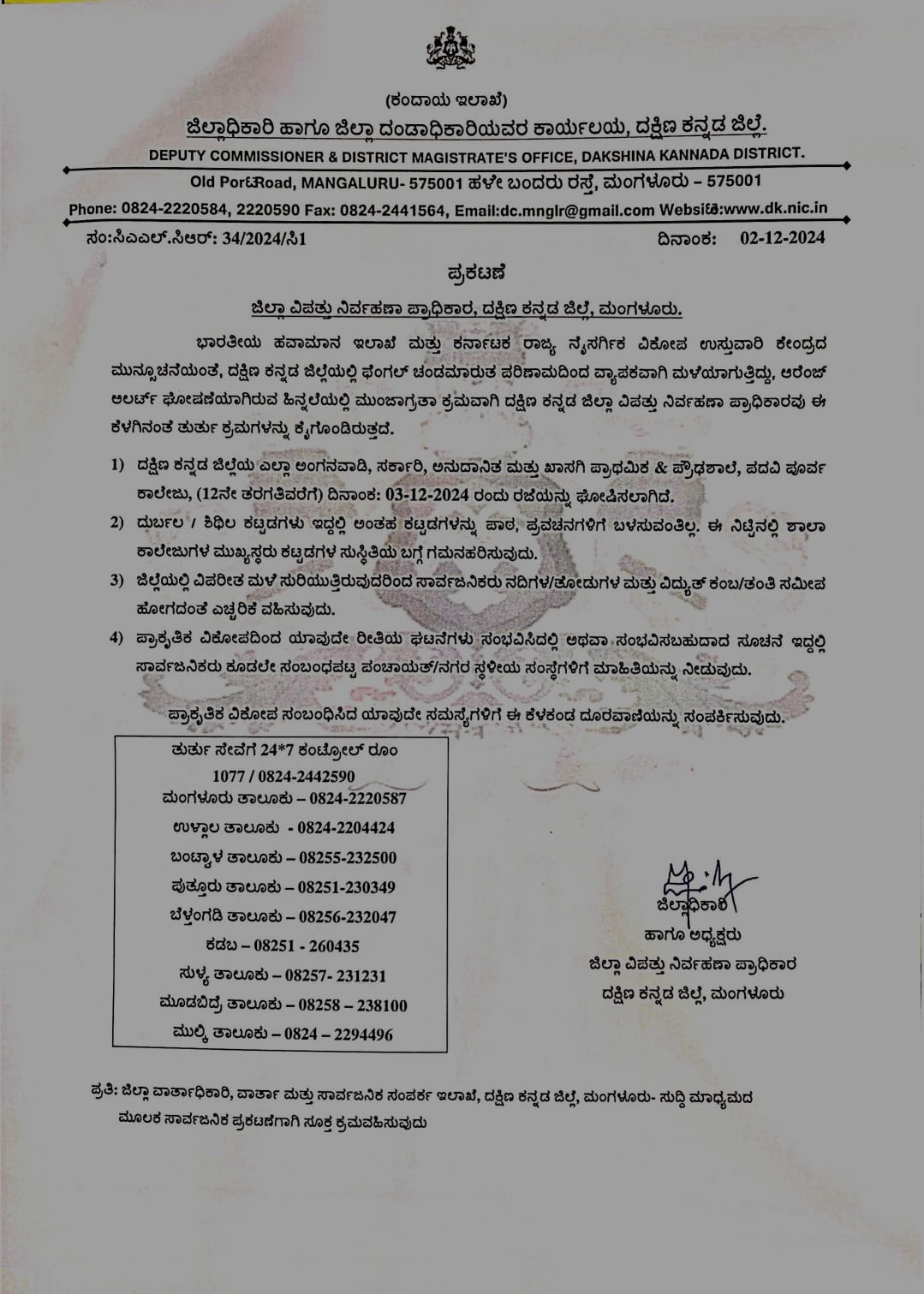 ಮಂಗಳೂರು : ಭಾರತೀಯ ಹವಾಮಾನ ಇಲಾಖೆಯು ನೀಡಿದ ಹವಾಮಾನದ ಮುನ್ಸೂಚ್ಚನೆಯಂತೆ ಬಂಗಾಲ ಕೊಲ್ಲಿ ಸಮುದ್ರದಲ್ಲಿ ಫೆಂಗಲ್ ಚಂಡ ಮಾರುತ ಉಂಟಾಗಿರುವ ಪರಿಣಾಮದಿಂದ ಕರಾವಳಿ ಜಿಲ್ಲೆಯಾದ್ಯಂತ ದಿನಾಂಕ 2-12-2024 ರಿಂದ 3-12-2024 ರವಗೆ ಗುಡುಗು ಸಹಿತ ಬಾರಿ ಮಳೆಯಾಗಲಿದ್ದು ಆರೆಂಜ್ ಅಲರ್ಟ್ ಘೋಷಿಸಿದ್ದಾರೆ.ದಕ್ಷಿಣ ಕನ್ನಡ ಜಿಲ್ಲೆಯ ಎಲ್ಲ ಅಂಗನವಾಡಿ ,ಸರ್ಕಾರಿ ಅನುದಾನಿತ ಮತ್ತು ಪ್ರಾಥಮಿಕ ,ಪ್ರೌಢಶಾಲೆ ,ಪದವಿ ಪೂರ್ವ ಕಾಲೇಜು ಪಿಯು ಸಿ ವರೆಗೆ ರಜೆಯನ್ನು ಜಿಲ್ಲಾಧಿಕಾರಿಯವರು ಘೋಷಿಸಿದ್ದಾರೆ .