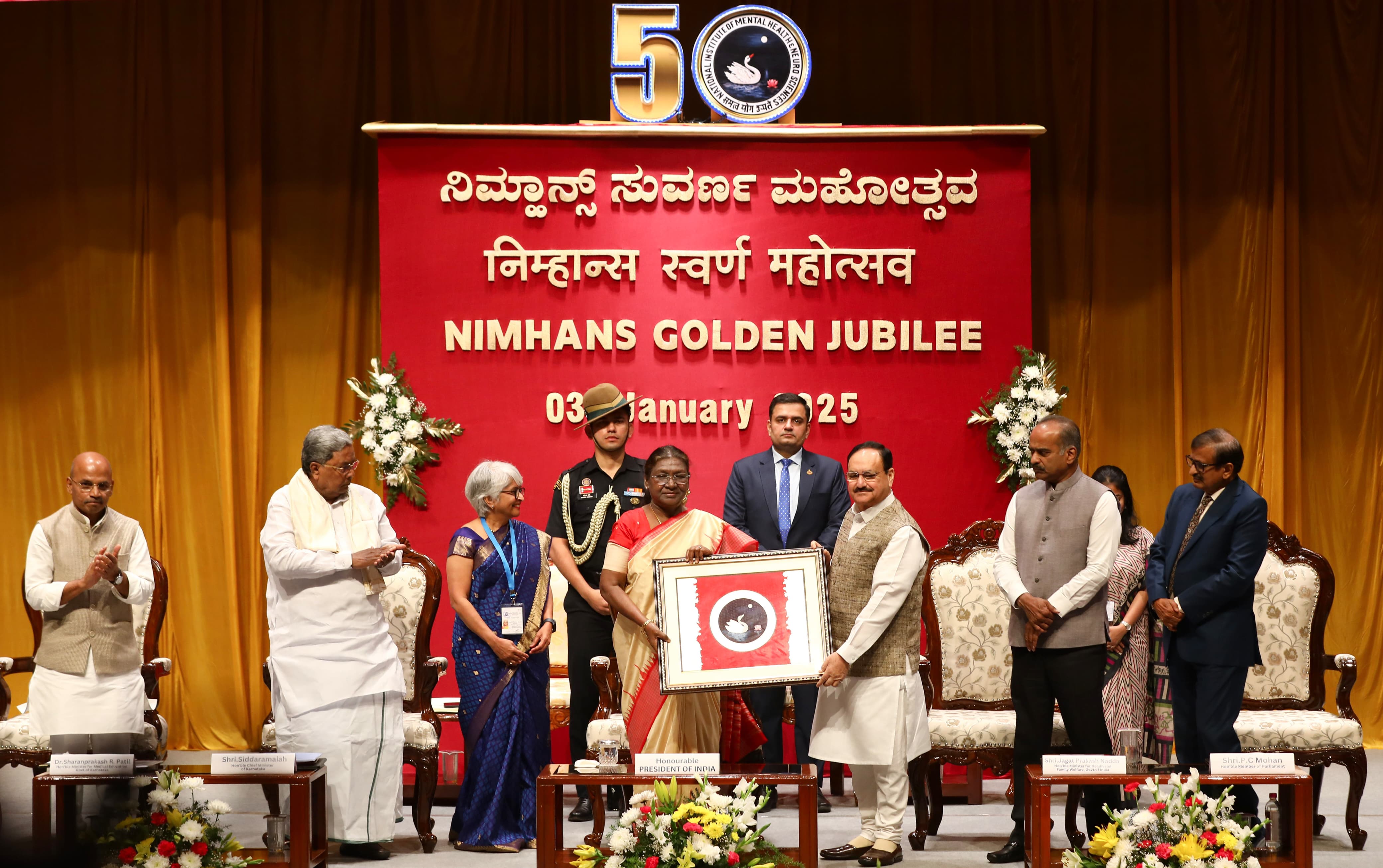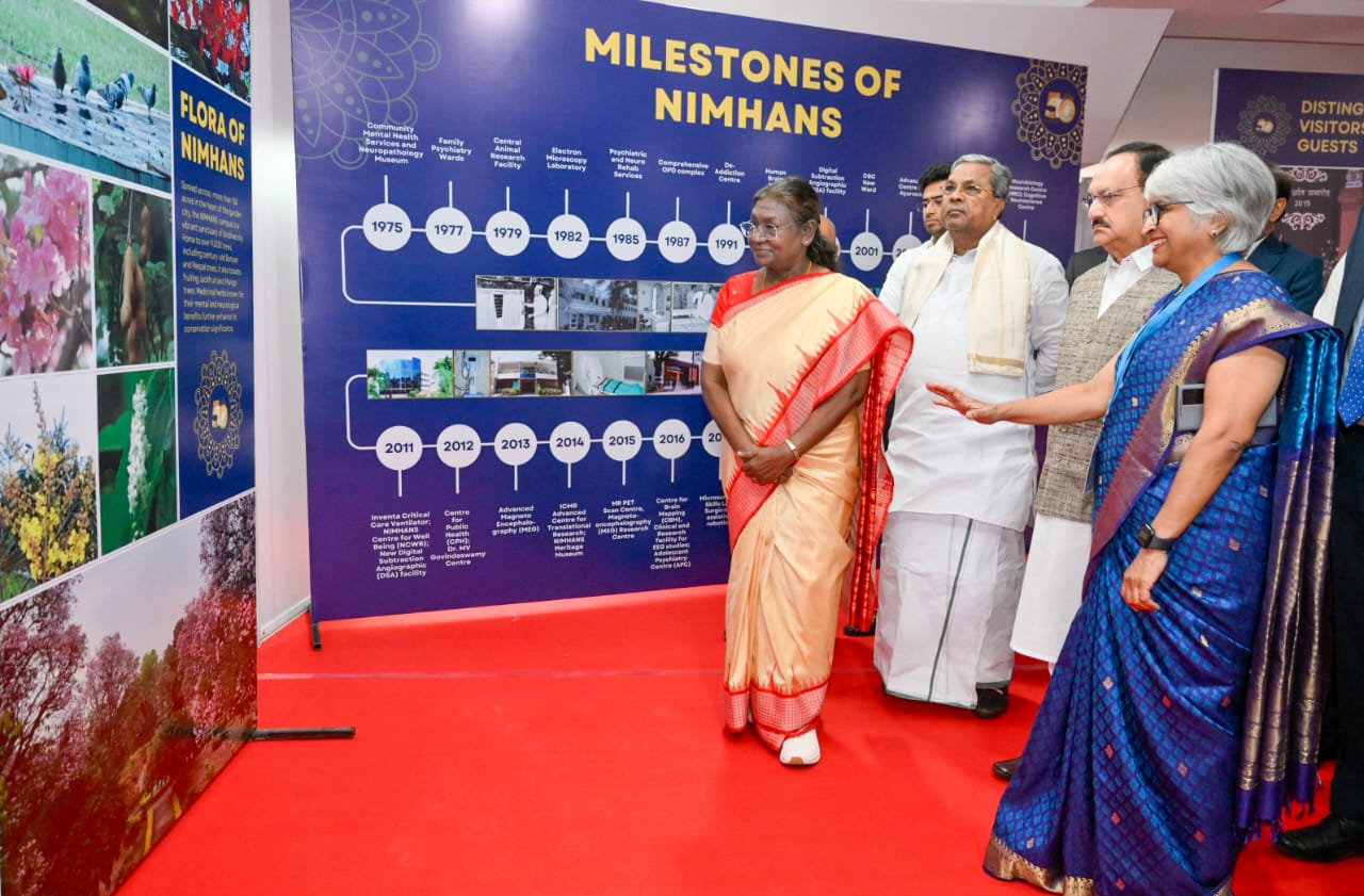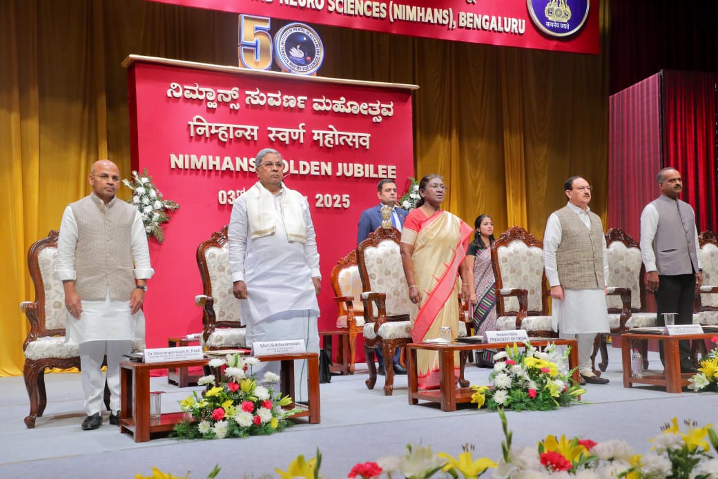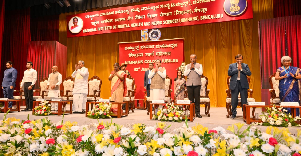 ರಾಷ್ಟ್ರೀಯ ಮಾನಸಿಕ ಆರೋಗ್ಯ ಮತ್ತು ನರವಿಜ್ಞಾನ ಸಂಸ್ಥೆ ( ನಿಮ್ಹಾನ್ಸ್) ಬೆಂಗಳೂರು ಇದರ ಸುವರ್ಣ ಮಹೋತ್ಸವ ಕಾರ್ಯಕ್ರಮ ದಲ್ಲಿ ಇಂದು ಭಾರತದ ಗೌರವಾನ್ವಿತ ರಾಷ್ಟ್ರಪತಿಗಳಾದ ಶ್ರೀಮತಿ ದ್ರೌಪದಿ ಮುರ್ಮು ಮುಖ್ಯ ಅತಿಥಿಗಳಾಗಿ ಭಾಗವಹಿಸಿದರು. ಸಮಾರಂಭದಲ್ಲಿ ಮುಖ್ಯಮಂತ್ರಿ ಸಿದ್ದರಾಮಯ್ಯ, ಕೇಂದ್ರ ಆರೋಗ್ಯ ಮತ್ತು ಕುಟುಂಬ ಕಲ್ಯಾಣ, ರಾಸಾಯನಿಕ ಮತ್ತು ರಸಗೊಬ್ಬರ ಖಾತೆ ಸಚಿವರು ಹಾಗೂ ನಿಮ್ಹಾನ್ಸ್ ಅಧ್ಯಕ್ಷರಾದ ಜಗತ್ ಪ್ರಕಾಶ್ ನಡ್ಡಾ, ವೈದ್ಯಕೀಯ ಶಿಕ್ಷಣ, ಕೌಶಲ್ಯಭಿವೃದ್ಧಿ ಸಚಿವರು ಹಾಗೂ ನಿಮ್ಹಾನ್ಸ್ ಉಪಾಧ್ಯಕ್ಷರಾದ ಡಾ.ಶರಣ್ ಪ್ರಕಾಶ್.ಆರ್ ಪಾಟೀಲ್, ಸಂಸದರಾದ ತೇಜಸ್ವಿ ಸೂರ್ಯ, ಯದುವೀರ್ ಕೃಷ್ಣದತ್ತ ಚಾಮರಾಜ ಒಡೆಯರ್, ಪಿ.ಸಿ.ಮೋಹನ್, ಸಿ.ಎನ್ ಮಂಜುನಾಥ್, ನಿಮ್ಹಾನ್ಸ್ ನಿರ್ದೇಶಕಿ ಡಾ.ಪ್ರತಿಮಾ ಮೂರ್ತಿ ಹಾಗೂ ಇನ್ನಿತರ ಗಣ್ಯರು ಉಪಸ್ಥಿತರಿದ್ದರು.