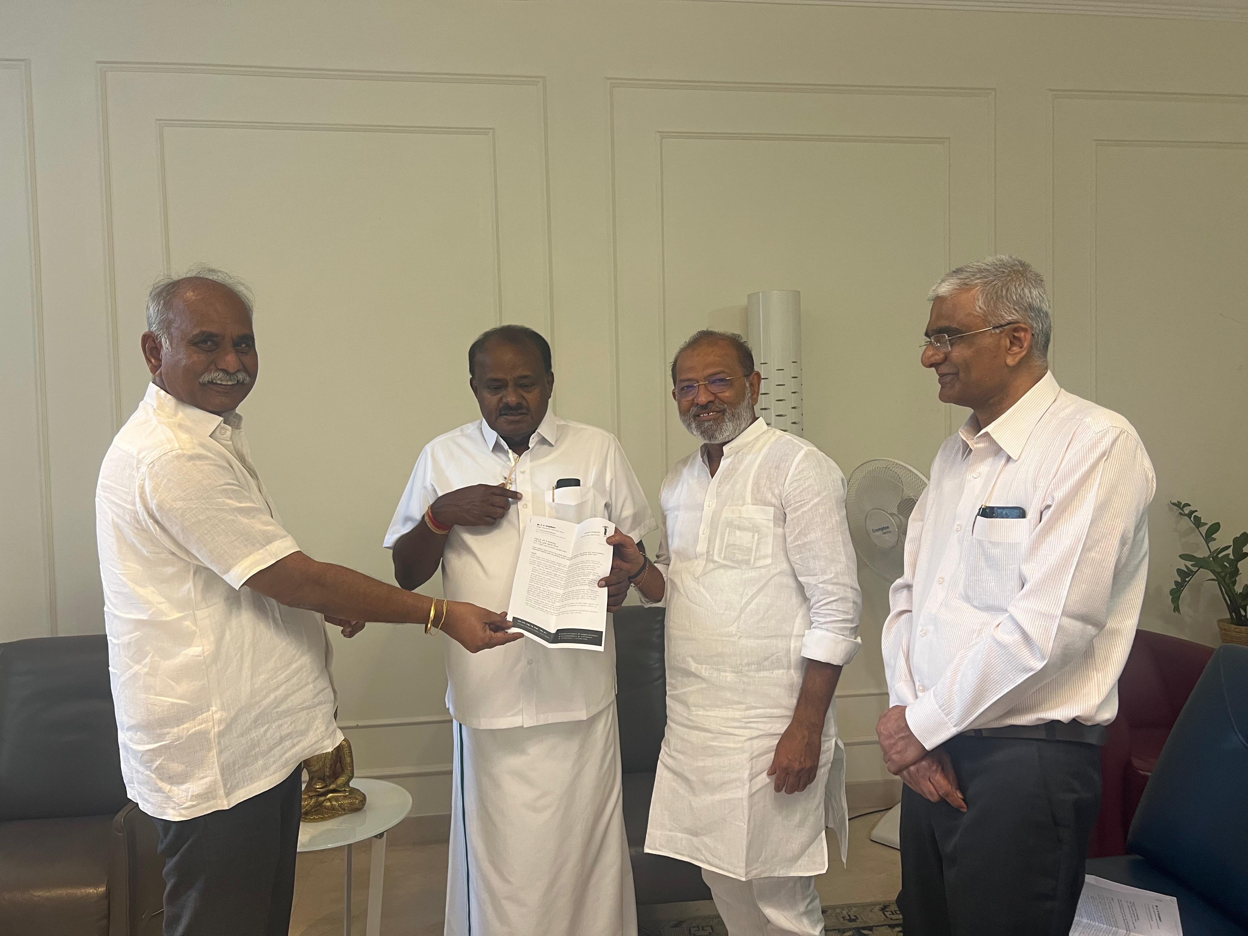 ಶೀರ್ಷಿಕೆ: ಜೆ ಡಿ (ಎಸ್) ರಾಜ್ಯ ಕೋರ್ ಕಮಿಟಿ ಸದಸ್ಯರಾದ ಸಿ ವಿ ಚಂದ್ರಶೇಖರ್ ಹಾಗೂ ಕೊಪ್ಪಳ ಜಿಲ್ಲಾ ಘಟಕದ ಅಧ್ಯಕ್ಷರಾದ ಸುರೇಶ್ ಭೂಮರೆಡ್ಡಿ ಅವರು ಕೇಂದ್ರದ ಉಕ್ಕು ಮತ್ತು ಬೃಹತ್ ಕೈಗಾರಿಕಾ ಸಚಿವರಾದ ಶ್ರೀ ಹೆಚ್ ಡಿ ಕುಮಾರಸ್ವಾಮಿ ಅವರನ್ನು ಶುಕ್ರವಾರ ಬೆಳಗ್ಗೆ ಭೇಟಿಯಾಗಿ ಕೊಪ್ಪಳದಲ್ಲಿ ರಾಜ್ಯ ಸರ್ಕಾರದೊಂದಿಗೆ ಕೈಗಾರಿಕಾ ಘಟಕ ಸ್ಥಾಪಿಸಲು ಬಲ್ದೋಟ ಸಮೂಹ ಕಂಪನಿ ಮಾಡಿಕೊಂಡ ಒಪ್ಪಂದವನ್ನು ವಿರೋಧಿಸಿ ಮಧ್ಯ ಪ್ರವೇಶಿಸುವಂತೆ ಕೋರಿ ಮನವಿ ಪತ್ರ ಸಲ್ಲಿಸಿದರು.