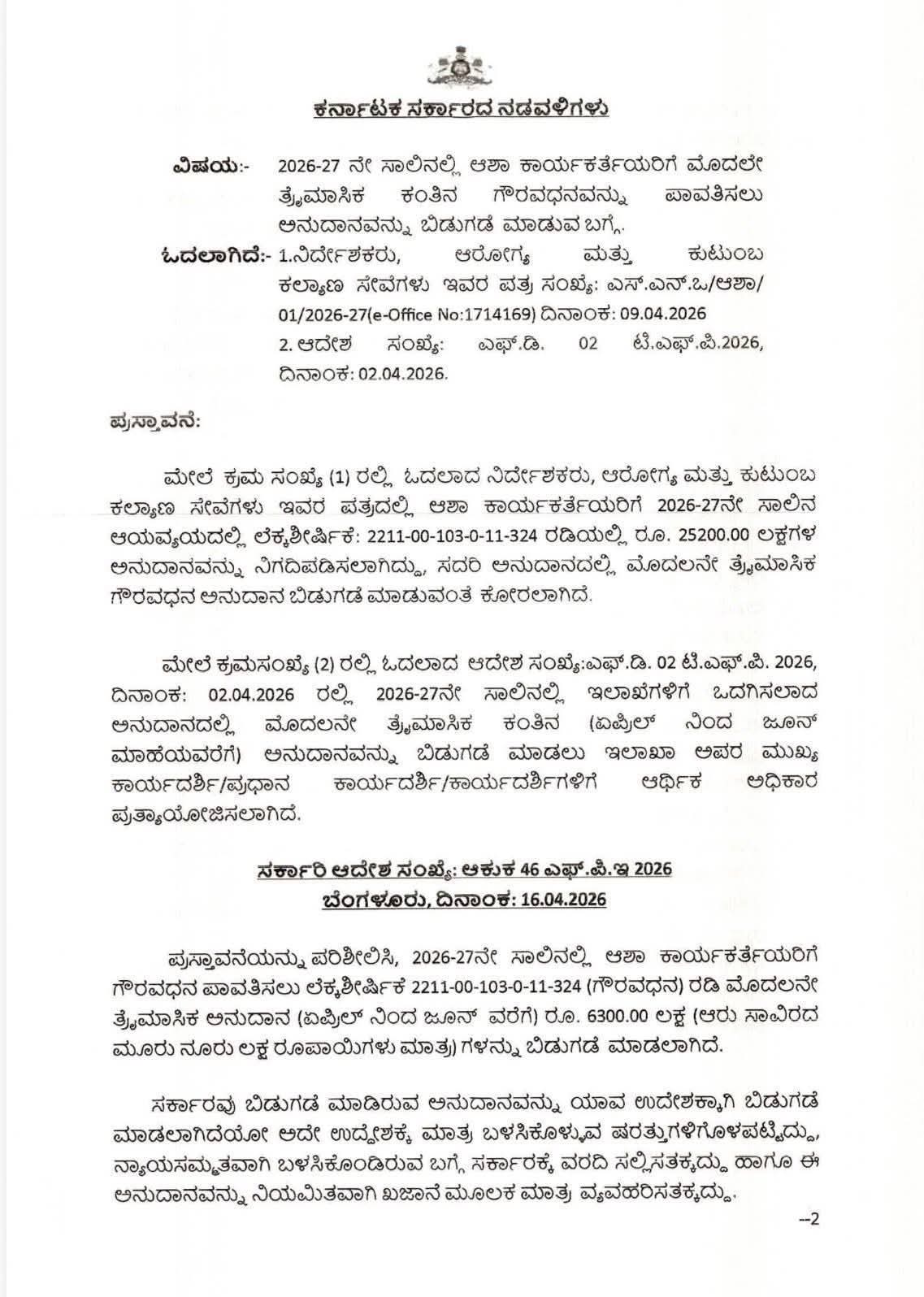 ಆರೋಗ್ಯ ಮತ್ತು ಕುಟುಂಬ ಕಲ್ಯಾಣ ಸೇವೆಗಳ ನಿರ್ದೇಶಕರ ಪತ್ರದ ಆಧಾರದ ಮೇಲೆ ಲೆಕ್ಕಶೀರ್ಷಿಕೆ 2211-00-103-0-11-324 ರಡಿ ಒಟ್ಟು ರೂ. 25,200 ಲಕ್ಷಗಳನ್ನು ನಿಗದಿಪಡಿಸಲಾಗಿದ್ದು, ಇದರಲ್ಲಿಂದ ಏಪ್ರಿಲ್–ಜೂನ್ ಅವಧಿಗೆ ಸಂಬಂಧಿಸಿದಂತೆ ರೂ. 6,300 ಲಕ್ಷಗಳನ್ನು ಬಿಡುಗಡೆ ಮಾಡುವಂತೆ ಸರ್ಕಾರ ಆದೇಶಿಸಿದೆ.