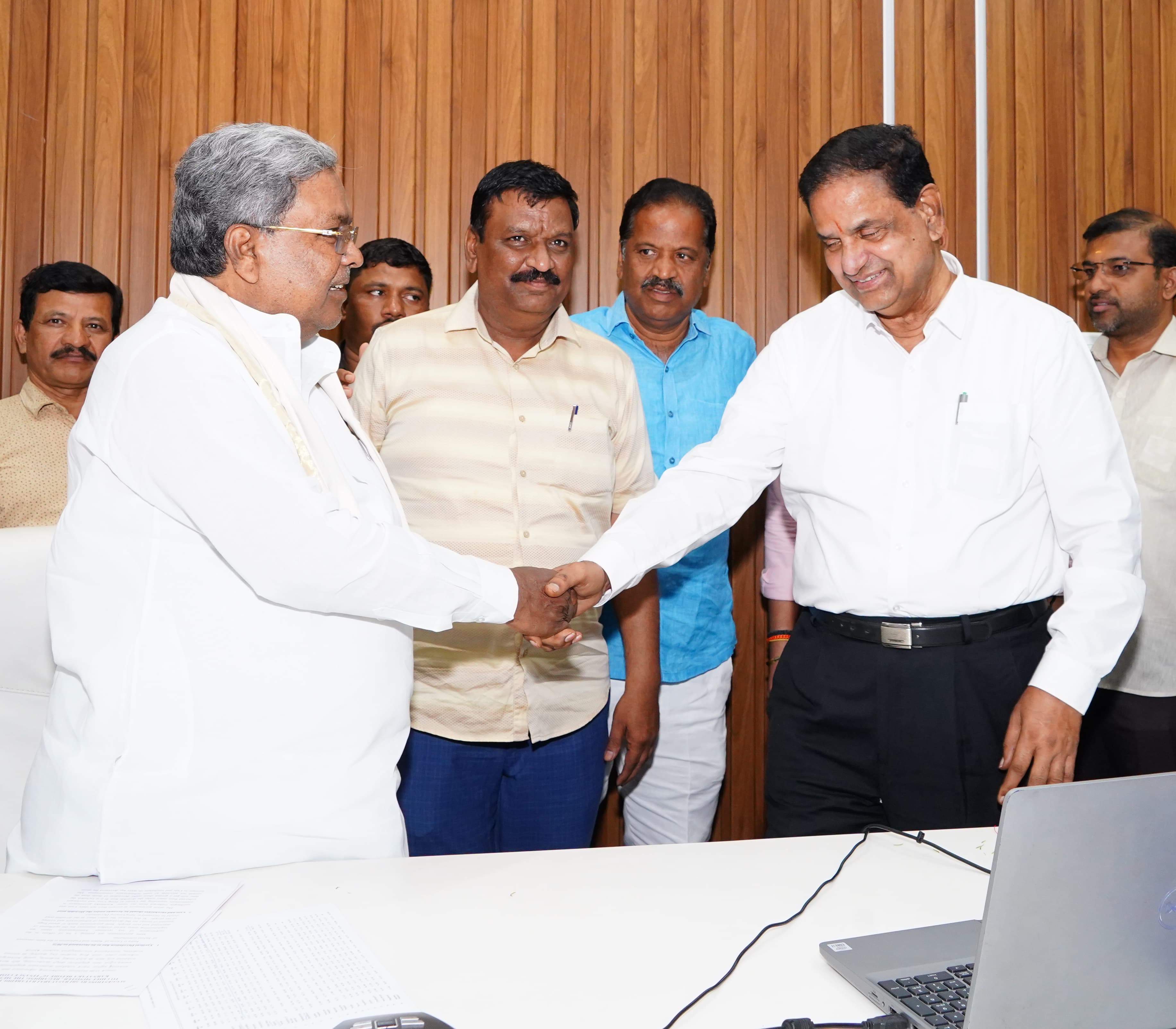 TTD ಅಧ್ಯಕ್ಷರಾದ ಬಿ.ಆರ್.ನಾಯ್ಡು ಅವರು ಕಾವೇರಿ ನಿವಾಸದಲ್ಲಿ ಮುಖ್ಯಮಂತ್ರಿ ಸಿದ್ದರಾಮಯ್ಯ ಅವರನ್ನು ಭೇಟಿಯಾಗಿ ಪ್ರಸಾದ ಅರ್ಪಿಸಿದರು.