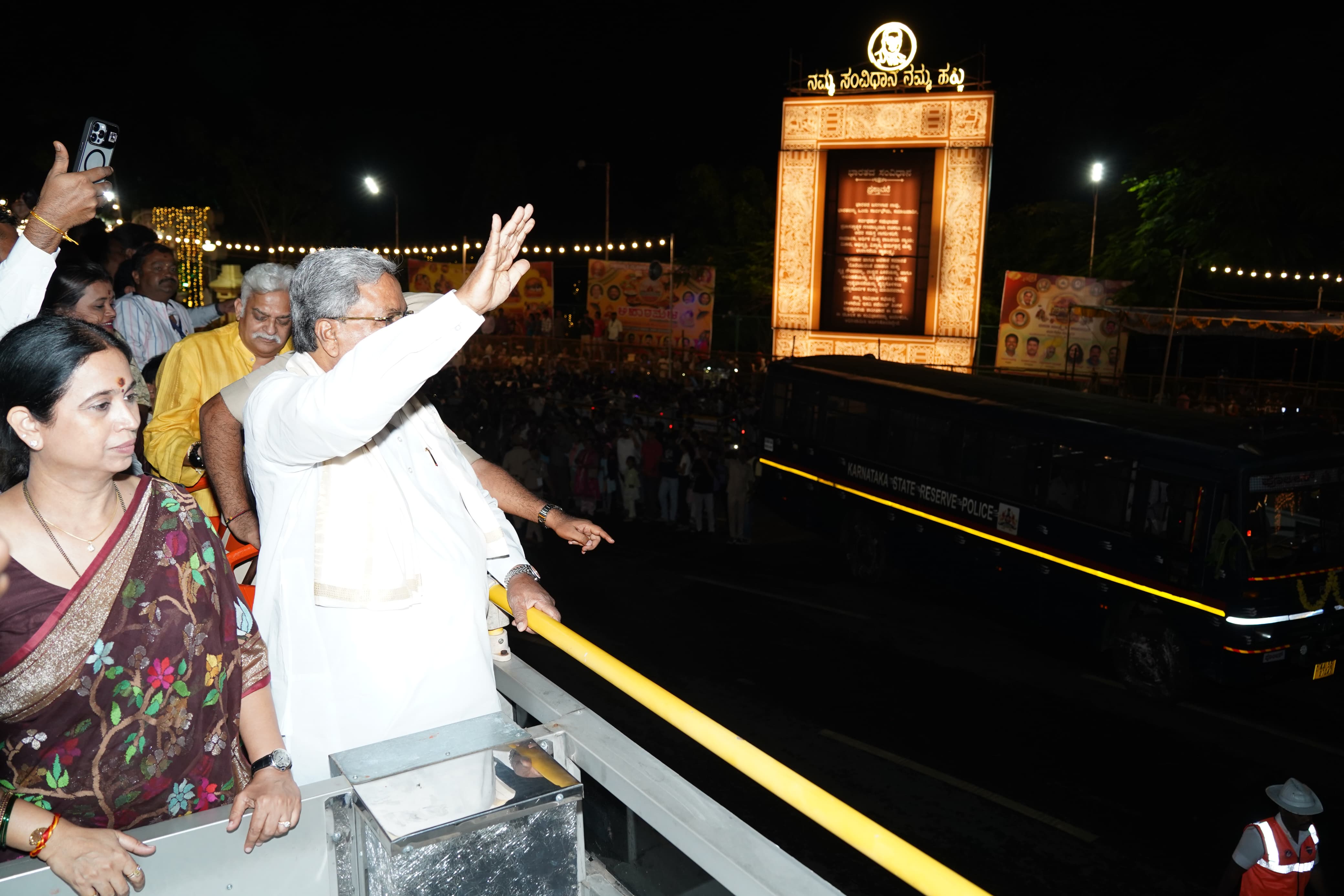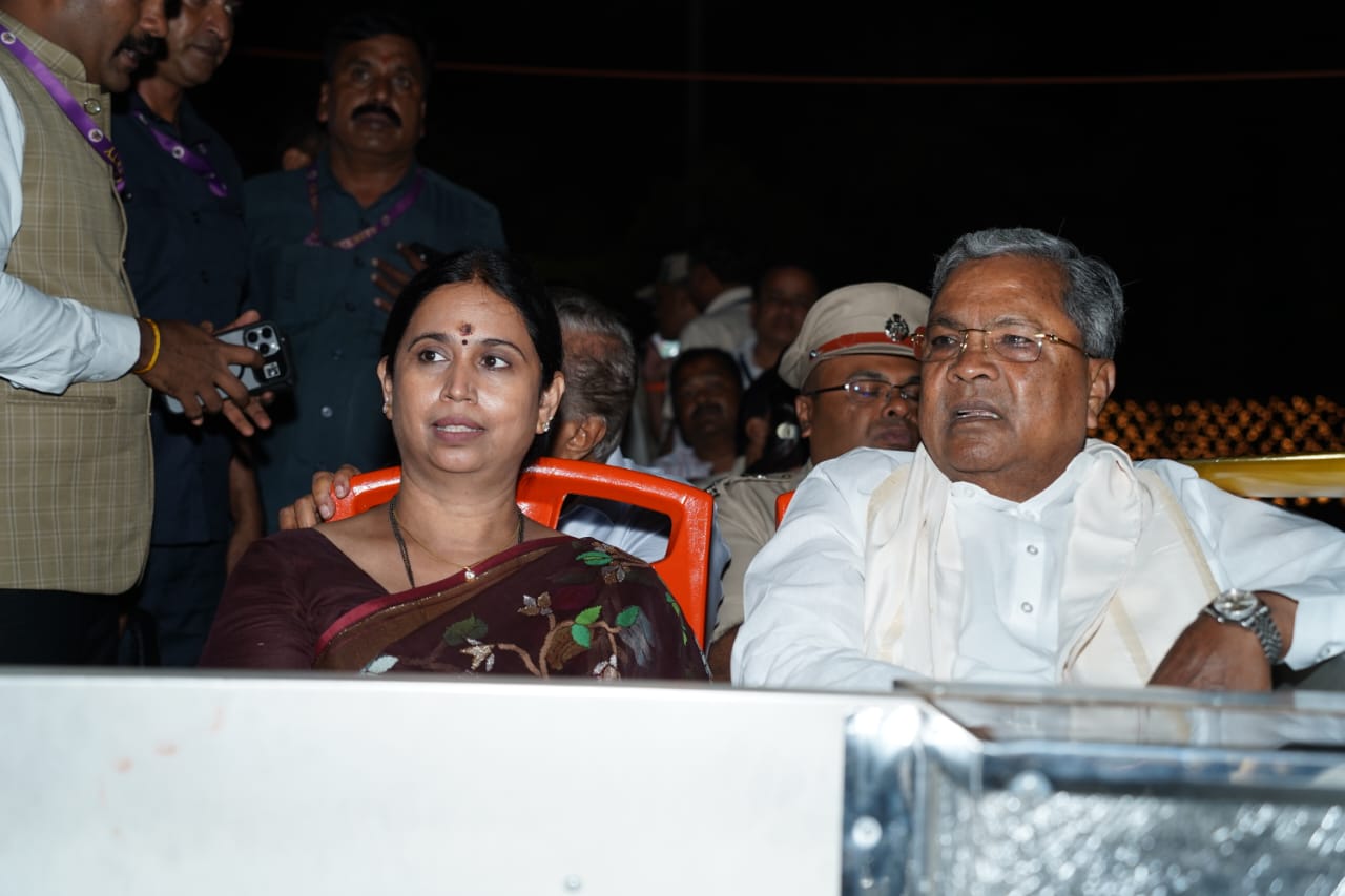 ಮುಖ್ಯಮಂತ್ರಿ ಸಿದ್ದರಾಮಯ್ಯ ಅವರು ತೆರೆದ ವಾಹನದಲ್ಲಿ ಮೈಸೂರು ನಗರ ಸಂಚರಿಸಿ ದಸರಾ ದೀಪಾಲಂಕಾರವನ್ನು ವೀಕ್ಷಿಸಿದರು ಮಹಿಳಾ ಮತ್ತು ಮಕ್ಕಳ ಕಲ್ಯಾಣ ಸಚಿವೆ ಲಕ್ಷ್ಮೀ ಹೆಬ್ಬಾಳ್ಕರ್ ಅವರು ಈ ಸಂದರ್ಭದಲ್ಲಿ ಜೊತೆಗಿದ್ದರು.(೧೧.೧೦.೨೦೨೪)
