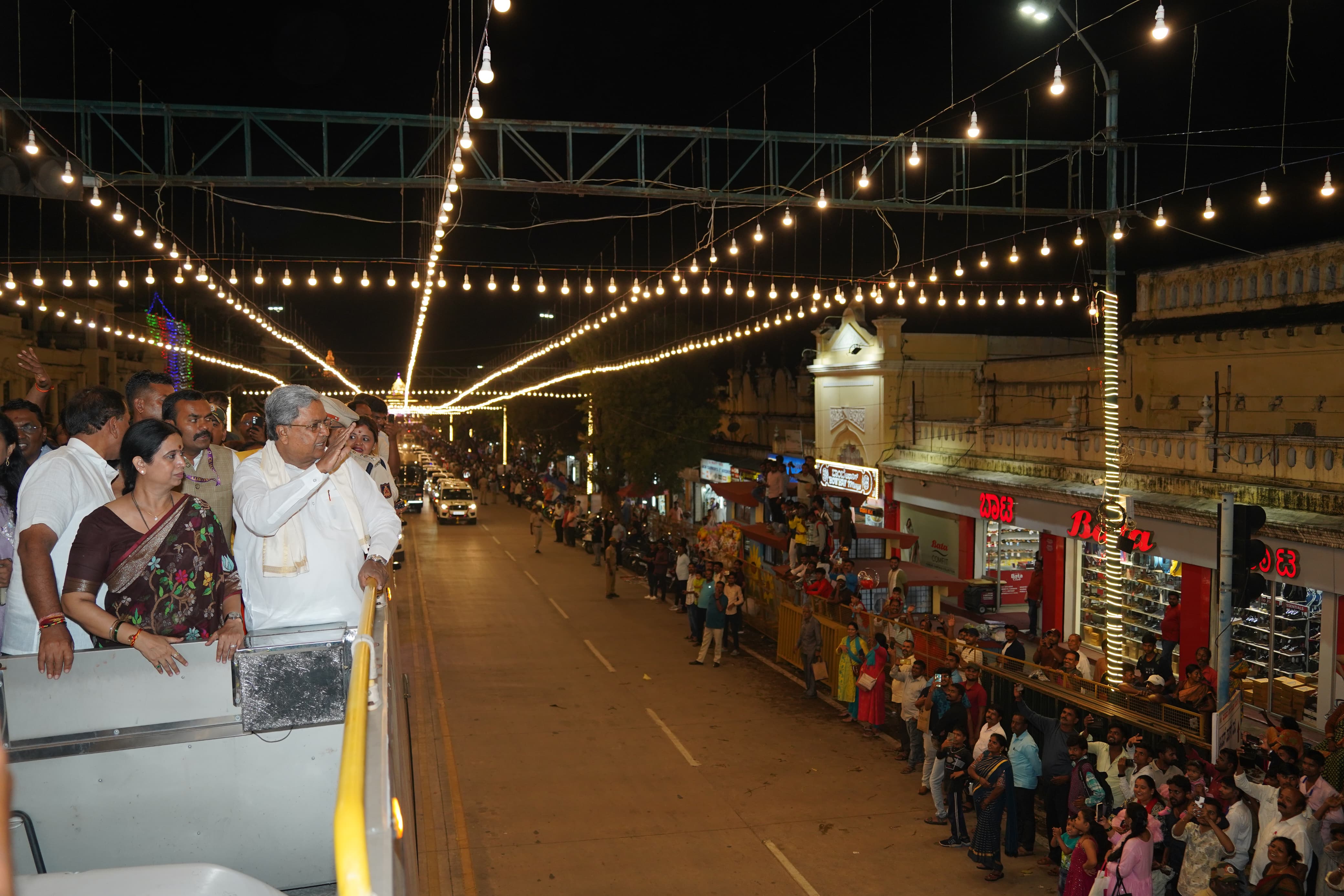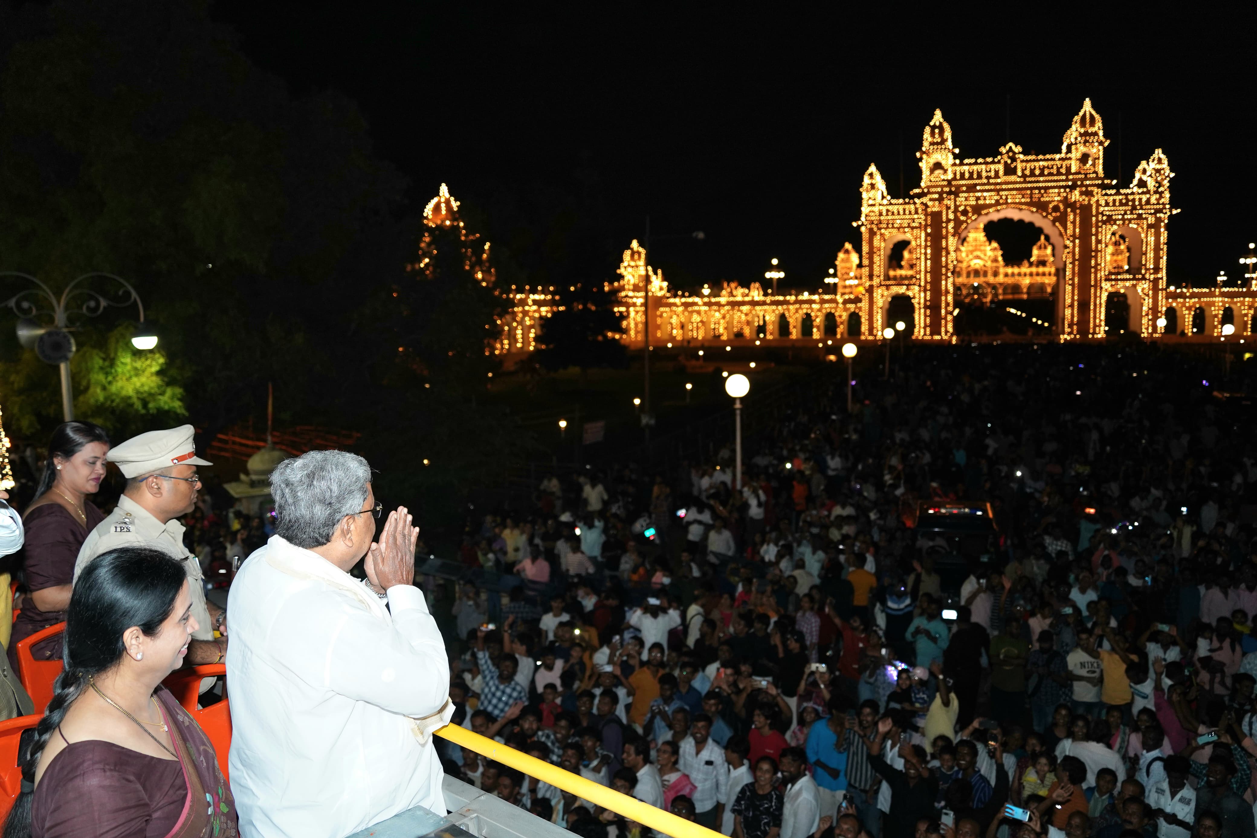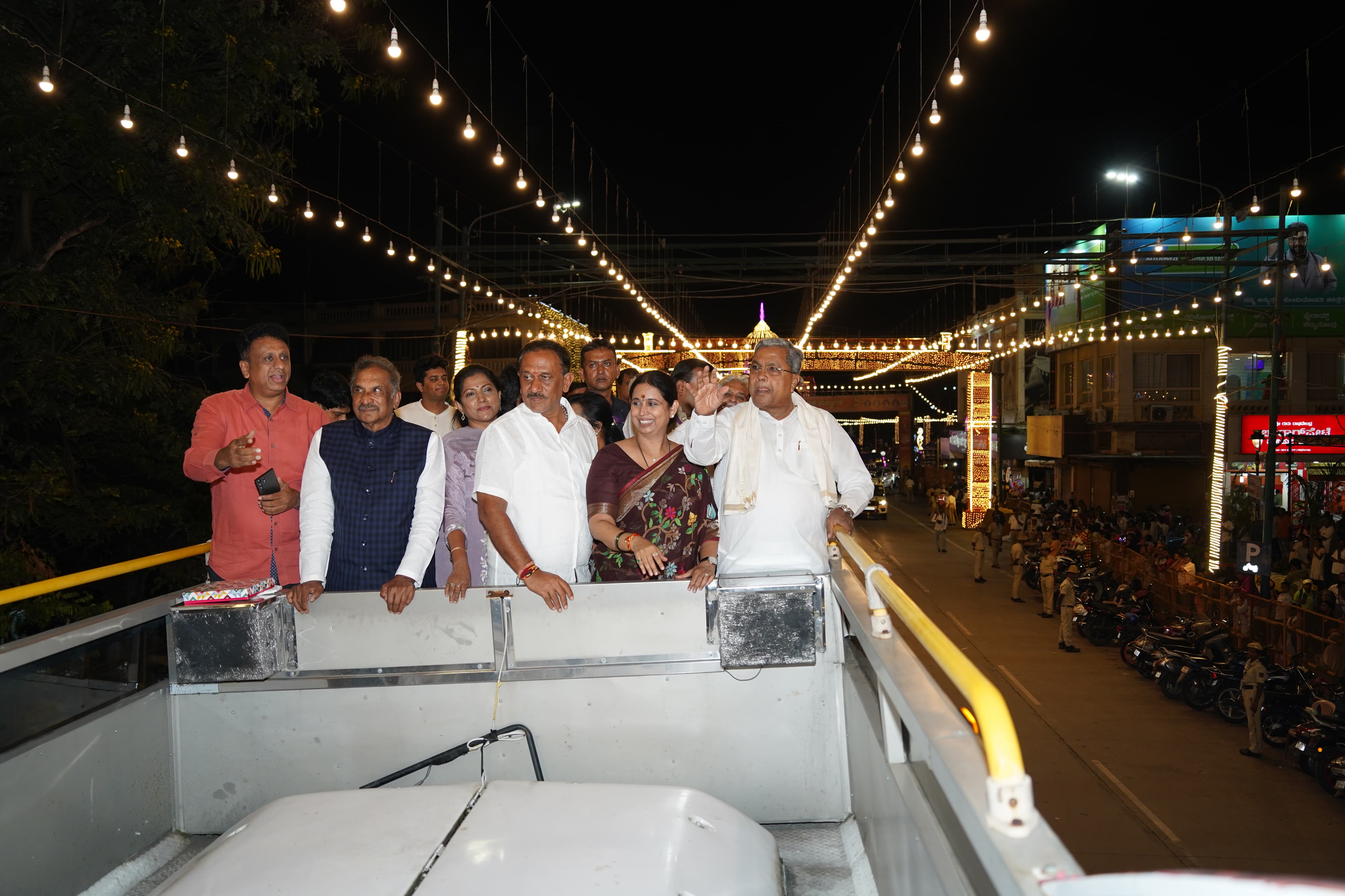 ಮುಖ್ಯಮಂತ್ರಿ ಸಿದ್ದರಾಮಯ್ಯ ಅವರು ತೆರೆದ ವಾಹನದಲ್ಲಿ ಮೈಸೂರು ನಗರ ಸಂಚರಿಸಿ ದಸರಾ ದೀಪಾಲಂಕಾರವನ್ನು ವೀಕ್ಷಿಸಿದರು