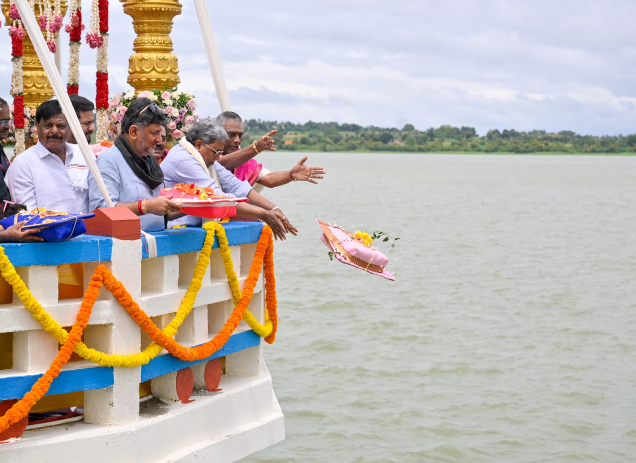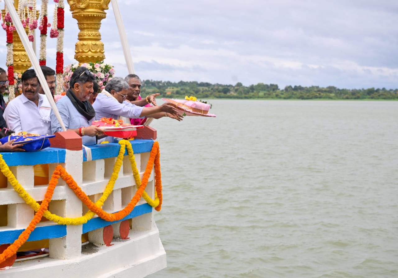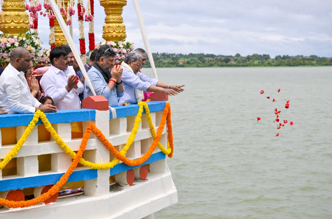 ಮೈಸೂರಿನ ಹೆಗ್ಗಡದೇವನಕೋಟೆಯಲ್ಲಿ ಭರ್ತಿಯಾಗಿರುವ ಕಬಿನಿ ಜಲಾಶಯಕ್ಕೆ ಜಲಸಂಪನ್ಮೂಲ ಸಚಿವರೂ ಆದ ಡಿಸಿಎಂ ಡಿ ಕೆ ಶಿವಕುಮಾರ್ ಅವರು ಭಾನುವಾರ ಬಾಗಿನ ಸಮರ್ಪಿಸಿದರು. ಸಿಎಂ ಸಿದ್ದರಾಮಯ್ಯ, ಸಚಿವ ಮಹದೇವಪ್ಪ ಮತ್ತಿತರರು ಇದ್ದರು.