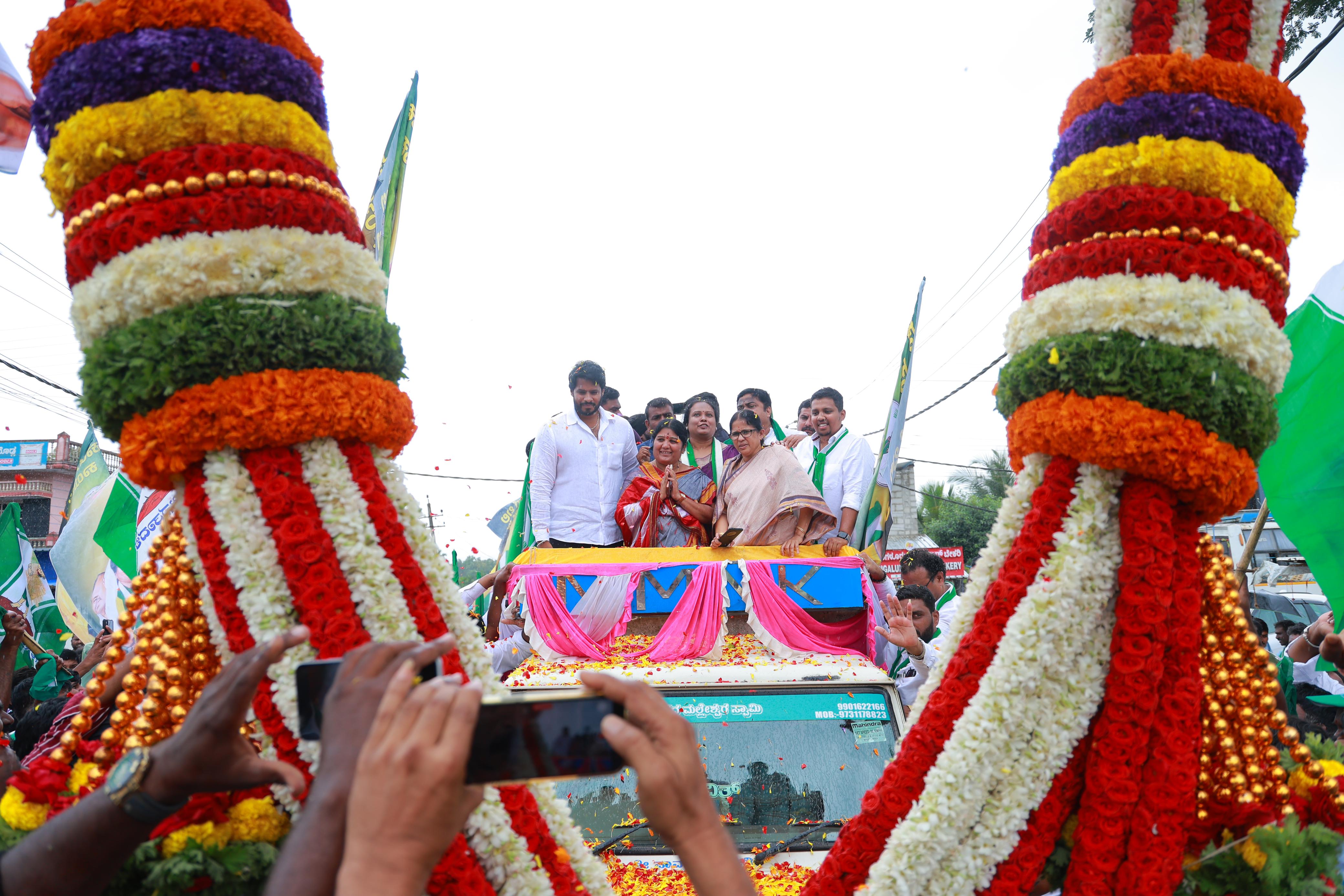 ಇದಕ್ಕೂ ಮುನ್ನ ಶಿಮೊಗ್ಗ ಗ್ರಾಮಾಂತರಕ್ಕೆ ಭೇಟಿ ಕೊಟ್ಟ ನಿಖಿಲ್ ಕುಮಾರಸ್ವಾಮಿ ಅವರನ್ನು ಅದ್ದೂರಿ ಹಾಗೆ ಸ್ವಾಗತ ಕೋರಿರದು, ಅರಹತೊಳಲು ಕೈಮರ ಸರ್ಕಲ್ ನಲ್ಲಿ ಬೃಹತ್ ಗಾತ್ರದ ಹೂವಿನ ಹಾರ ಹಾಕುವುದರ ಮೂಲಕ ಅದ್ದೂರಿಯಾಗಿ ಬರ ಮಾಡಿಕೊಂಡರು.
