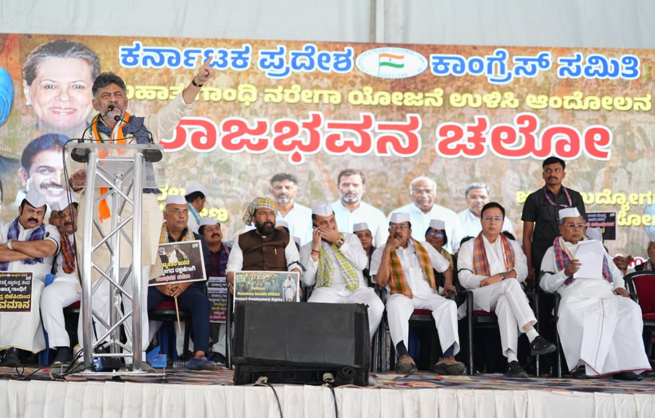 ಸ್ವಾತಂತ್ರ್ಯ ಉದ್ಯಾನದಲ್ಲಿ ಮಂಗಳವಾರ ನಡೆದ ರಾಜಭವನ ಚಲೋ ಮಹಾತ್ಮ ಗಾಂಧಿ ನರೇಗಾ ಬಚಾವ್ ಸಂಗ್ರಾಮ ಪ್ರತಿಭಟನೆ ಕಾರ್ಯಕ್ರಮದಲ್ಲಿ ಕೆಪಿಸಿಸಿ ಅಧ್ಯಕ್ಷರೂ ಆಗಿರುವ ಶಿವಕುಮಾರ್ ಅವರು ಮಾತನಾಡಿದರು.