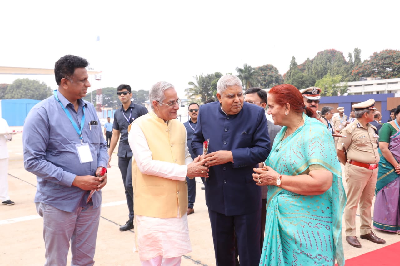 ಗೌರವಾನ್ವಿತ ಉಪರಾಷ್ಟ್ರಪತಿಗಳು ಅಕ್ಟೋಬರ್ 25 ರಂದು ಮೂಲಕ ಮಂಡ್ಯ ಜಿಲ್ಲೆಯ ನಾಗಮಂಗಲದ ಬಿ.ಜಿ. ನಗರದಲ್ಲಿರುವ ಆದಿಚುಂಚನಗಿರಿ ವಿಶ್ವವಿದ್ಯಾಲಯವು ಆಯೋಜಿಸಿದ್ದ ಕಾರ್ಯಕ್ರಮದಲ್ಲಿ ಮುಖ್ಯ ಅತಿಥಿಗಳಾಗಿ ಭಾಗವಹಿಸಿದ್ದರು. ಇಂದು ಅಕ್ಟೋಬರ್ 26 ರಂದು ಬೆಂಗಳೂರು ಅರಮನೆ ಮೈದಾನದಲ್ಲಿ ಜಗದ್ಗುರು *ಶಂಕರಾಚಾರ್ಯ ಪರಮಪೂಜ್ಯ ಶ್ರೀ ಶ್ರೀ ಭಾರತೀ ತೀರ್ಥ ಮಹಾಸ್ವಾಮಿಗಳವರ ಸನ್ಯಾಸ ಸ್ವೀಕಾರದ ಸುವರ್ಣ ಮಹೋತ್ಸವದ* ನಿಮಿತ್ತ ಜಗದ್ಗುರು ಶಂಕರಾಚಾರ್ಯ ಪರಮಪೂಜ್ಯ ಶ್ರೀ ಶ್ರೀ ವಿಧುಶೇಖರಭಾರತೀ ದಿವ್ಯಸಾನಿಧ್ಯದಲ್ಲಿ *ನಮಃ ಶಿವಾಯ* ಸ್ತೋತ್ರಮಹಾಸಮರ್ಪಣೆ ಕಾರ್ಯಕ್ರಮದಲ್ಲಿ ಭಾಗವಹಿಸಿ ಇಂದು ಹೆಚ್.ಎ.ಎಲ್ ವಿಮಾನ ನಿಲ್ದಾಣದಿಂದ ನಿರ್ಗಮಿಸಿದರು.