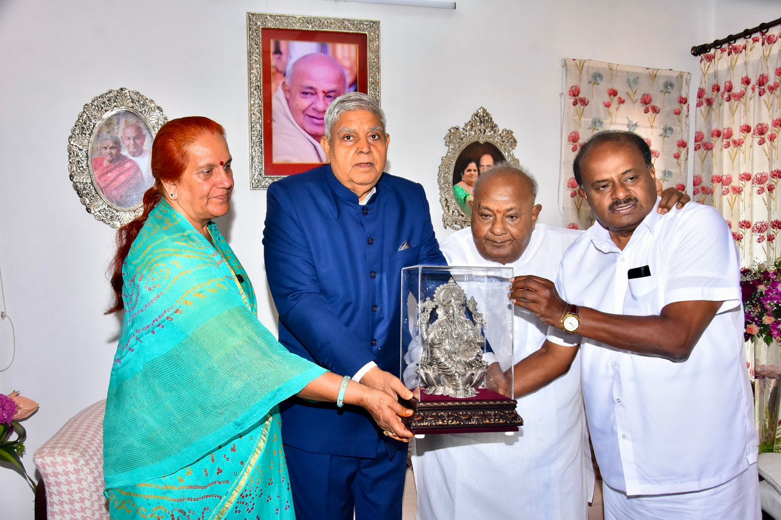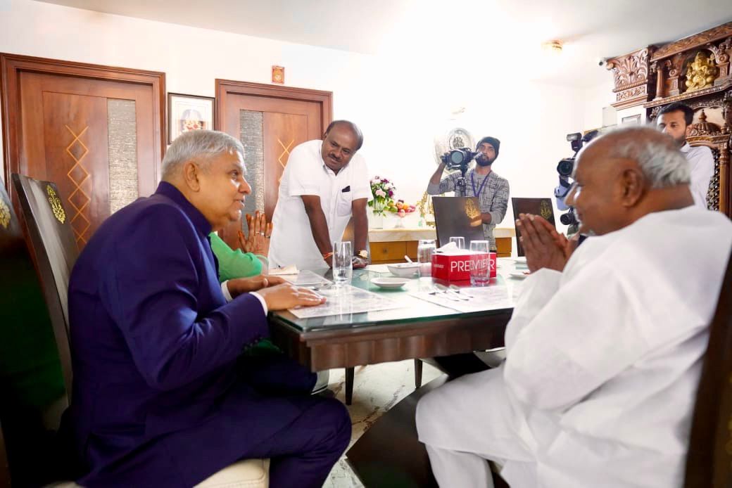 ಉಪರಾಷ್ಟ್ರಪತಿ ಜಗದೀಪ್ ಧನಕರ್ ಮಾಜಿ ಪ್ರಧಾನಿ ಹೆಚ್.ಡಿ.ದೇವೇಗೌಡರ ನಿವಾಸಕ್ಕೆ ಭೇಟಿ ನೀಡಿ ಯೋಗಕ್ಷೇಮ ವಿಚಾರಿಸಿದರು.. ಕೇಂದ್ರ ಸಚಿವ ಹೆಚ್.ಡಿ.ಕುಮಾರಸ್ವಾಮಿ ಹಾಜರಿದ್ದರು.