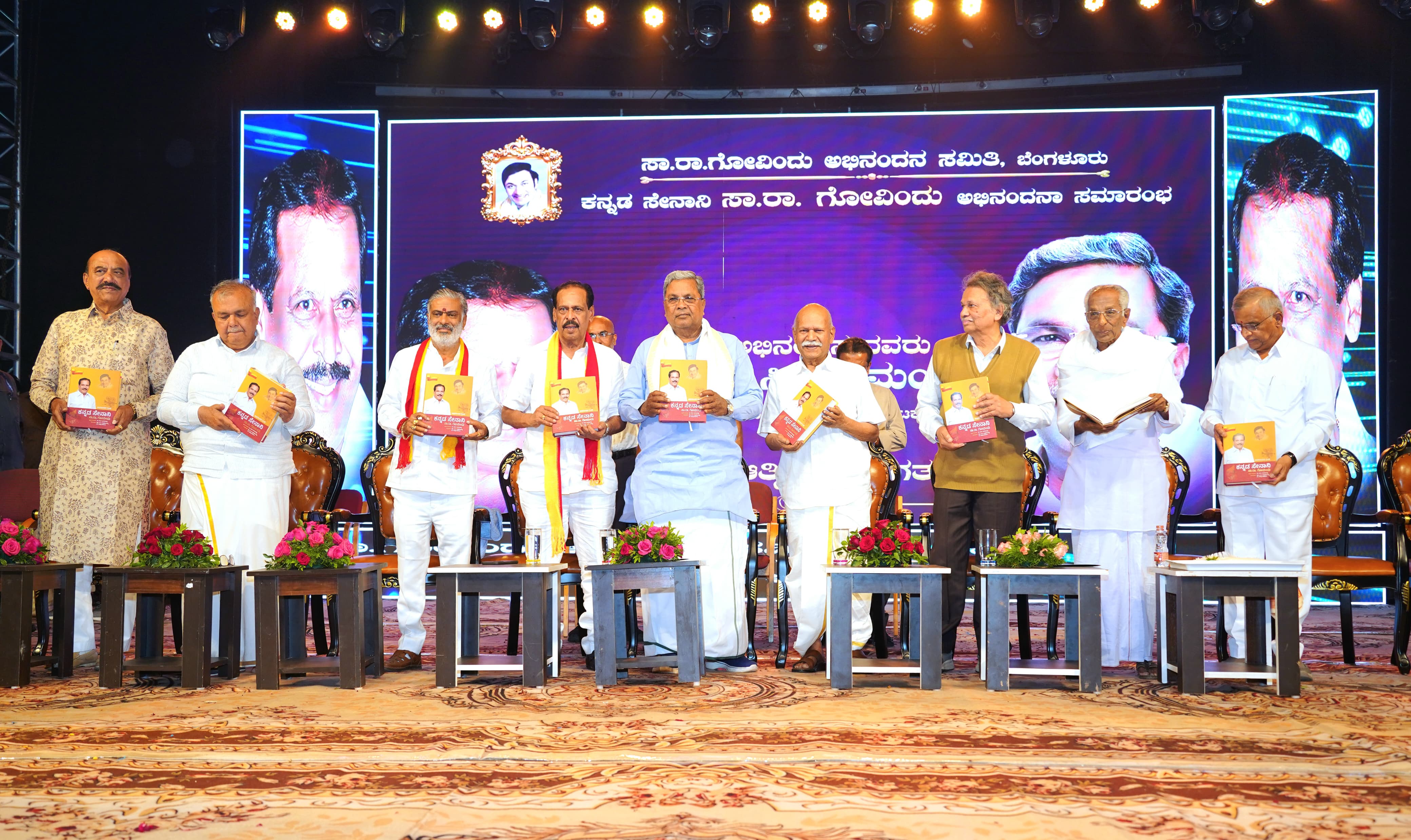 ರವೀಂದ್ರ ಕಲಾ ಕ್ಷೇತ್ರದಲ್ಲಿ ಕನ್ನಡ ಸೇನಾನಿ ಸಾ.ರಾ.ಗೋವಿಂದು ಅವರ ಅಭಿನಂದನ ಕಾರ್ಯಕ್ರಮದಲ್ಲಿ ಗೋವಿಂದು ಅವರನ್ನು ಸನ್ಮಾನಿಸಿ, ಅಭಿನಂದಿಸಿ ಮಾತನಾಡಿದರು.