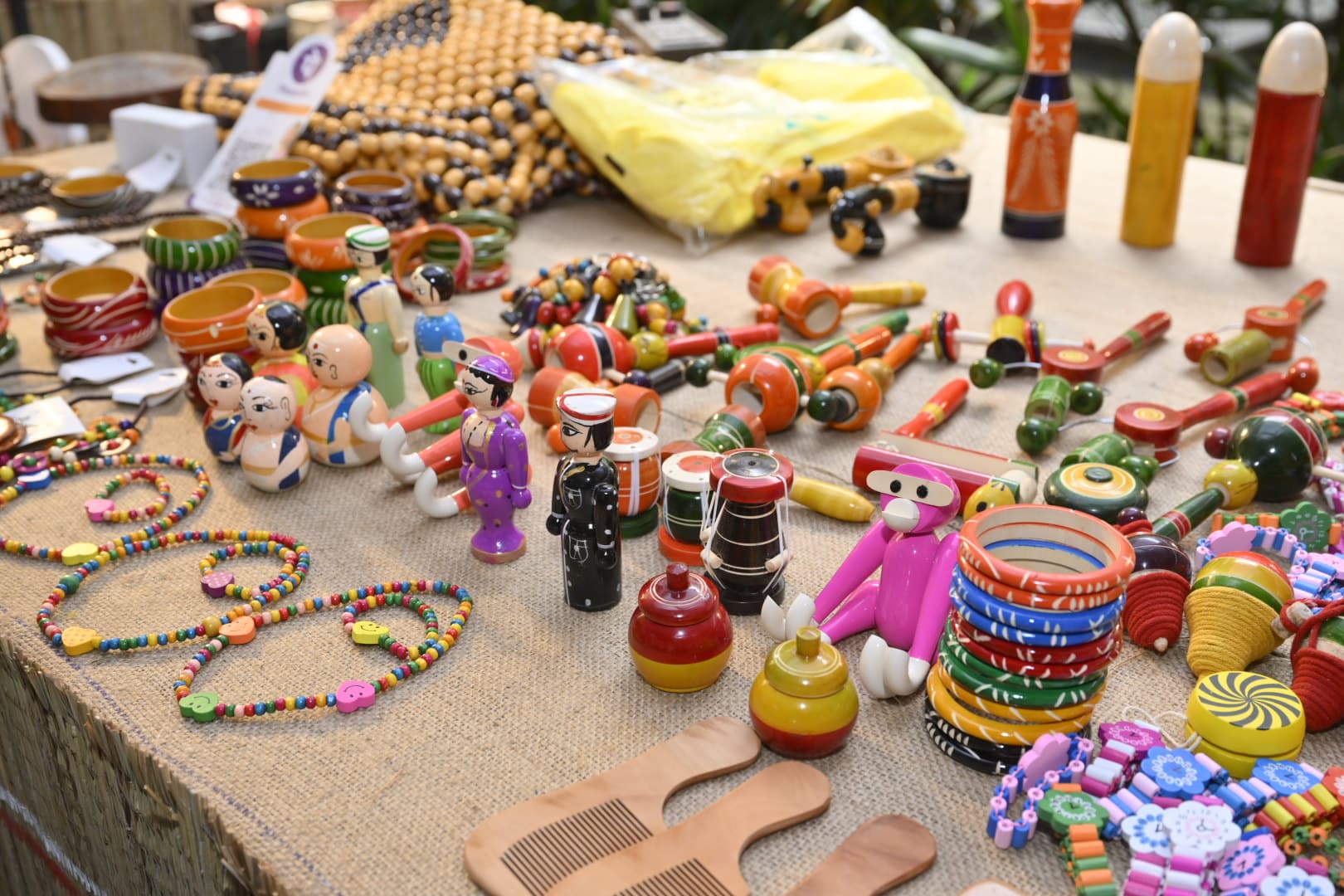 ಬಿದರಿ ಕಲೆ, ಕಿನ್ನಾಳ ಕಲೆ, ಮೈಸೂರು ಇನ್ಲೆ, ಚನ್ನಪಟ್ಟಣದ ಬೊಂಬೆಗಳು, ಕೈಯಿಂದ ತಯಾರಿಸಿದ ಆಭರಣಗಳು, ಜಿ.ಐ.ಟ್ಯಾಗ್ ಹೊಂದಿರುವ ಸೀರೆಗಳು, ಮೊಳಕಾಲ್ಮೂರು, ಇಳಕಲ್ ಸೀರೆಗಳು ಮಾರಾಟ ಮಾಡಲಾಗುತ್ತಿದೆ.