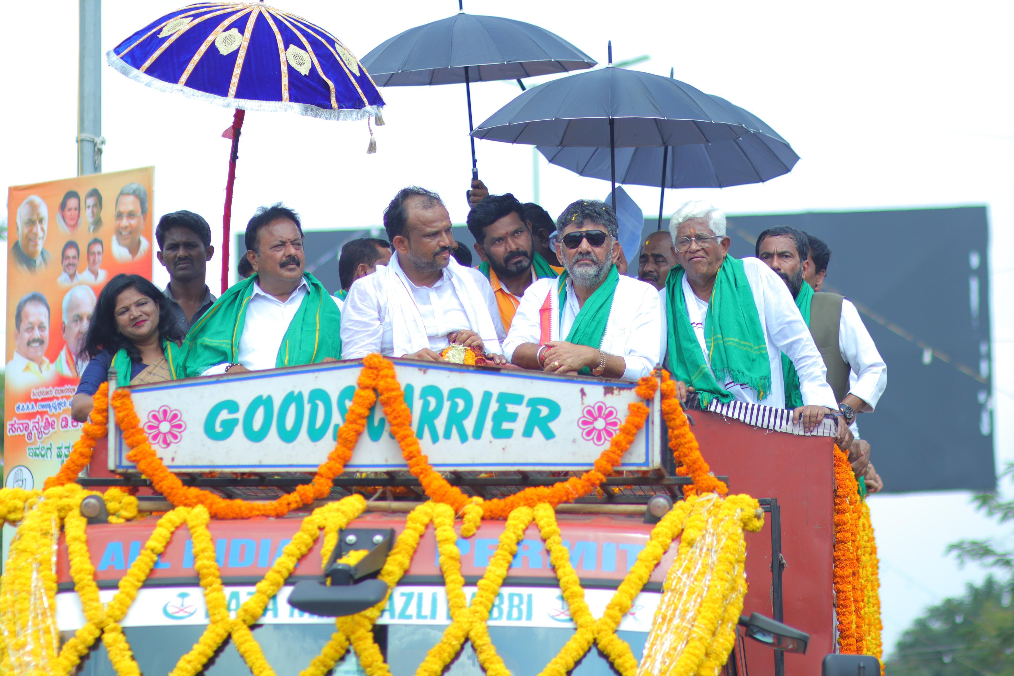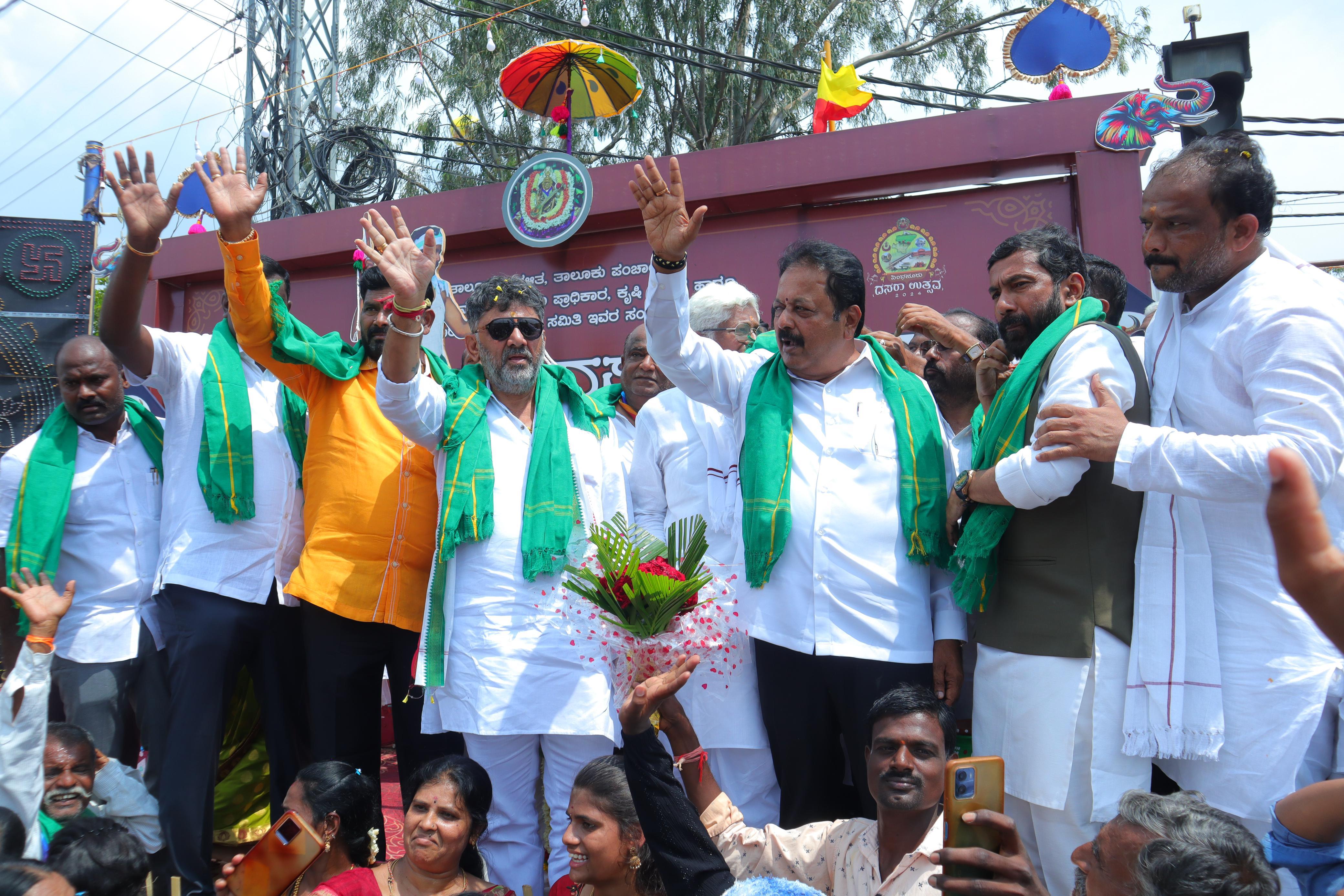 ರಾಯಚೂರು ಜಿಲ್ಲೆಯ ಸಿಂಧನೂರಿನಲ್ಲಿ ಮಂಗಳವಾರ ನಡೆದ "ರೈತ ದಸರಾ” ಕಾರ್ಯಕ್ರಮ ಉದ್ಘಾಟನೆಗೂ ಮುನ್ನ ಡಿಸಿಎಂ ಡಿ.ಕೆ. ಶಿವಕುಮಾರ್ ಅವರು ತಹಶೀಲ್ದಾರ್ ಕಚೇರಿಯಿಂದ ಎಪಿಎಂಸಿವರೆಗೆ ಅದ್ಧೂರಿ ಮೆರವಣಿಗೆಯಲ್ಲಿ ತೆರಳಿದರು
