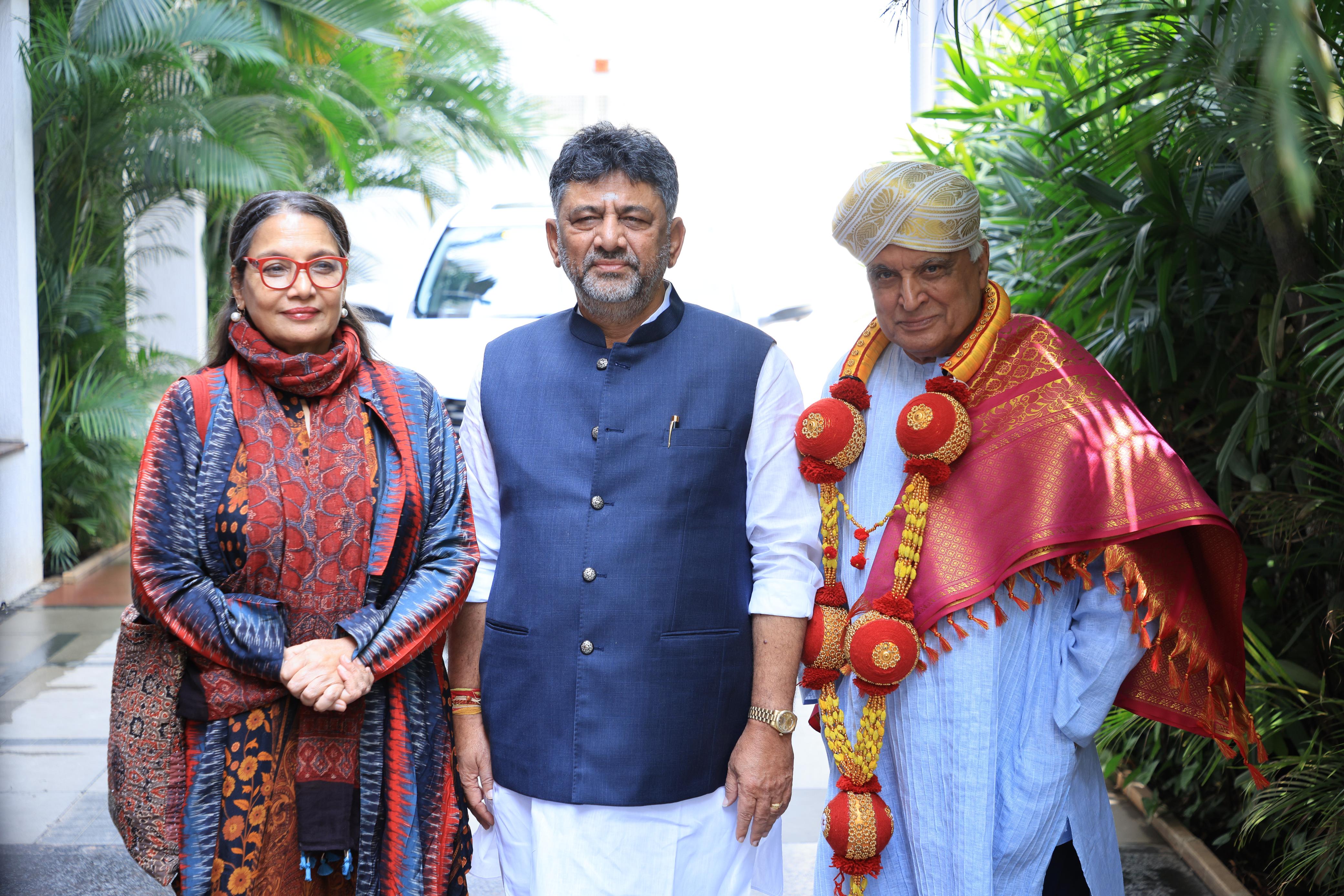 ಬೆಂಗಳೂರಿನಲ್ಲಿ ಇತ್ತೀಚೆಗೆ ನಡೆದ 16ನೇ ಅಂತಾರಾಷ್ಟ್ರೀಯ ಚಲನಚಿತ್ರೋತ್ಸವದಲ್ಲಿ ಜೀವಮಾನ ಸಾಧನೆ ಪ್ರಶಸ್ತಿಗೆ ಭಾಜನರಾಗಿರುವ ಹಿರಿಯ ಚಿತ್ರನಟಿ ಶಬಾನಾ ಆಜ್ಮಿ ಹಾಗೂ ಅವರ ಪತಿ, ಖ್ಯಾತ ಗೀತರಚನೆಕಾರ ಜಾವೇದ್ ಅಖ್ತರ್ ಅವರನ್ನು ಡಿಸಿಎಂ ಡಿ ಕೆ ಶಿವಕುಮಾರ್ ಅವರು ಸದಾಶಿವನಗರದ ತಮ್ಮ ನಿವಾಸದಲ್ಲಿ ಸೋಮವಾರ ಅಭಿನಂದಿಸಿದರು.