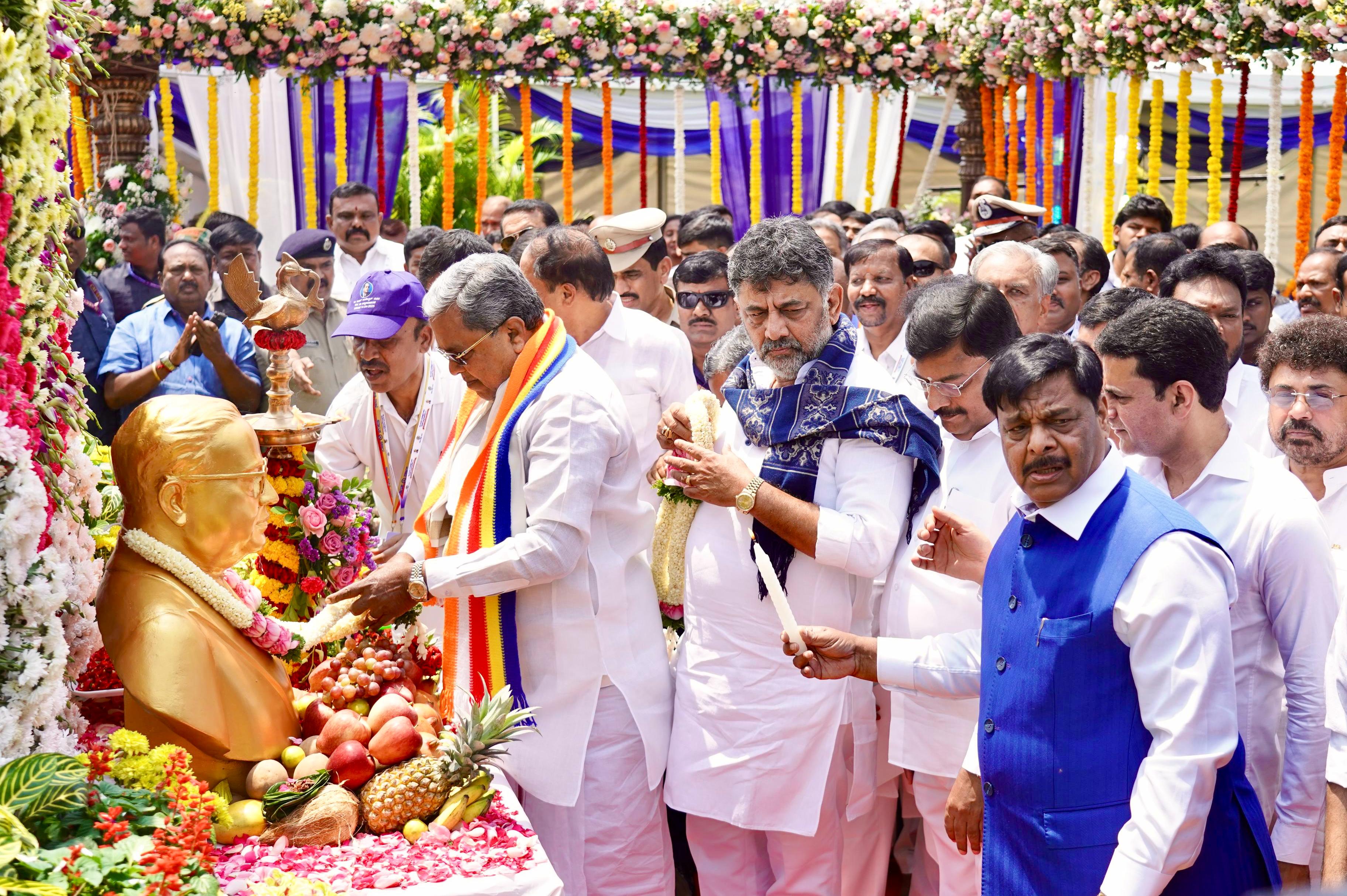 ಬೆಂಗಳೂರು , ಏಪ್ರಿಲ್ 14: ಮಾನ್ಯ ಮುಖ್ಯಮಂತ್ರಿ ಸಿದ್ದರಾಮಯ್ಯ ಅವರು ಇಂದು ಸಂವಿಧಾನ ಶಿಲ್ಪಿ ಡಾ: ಬಿ. ಆರ್.ಅಂಬೇಡ್ಕರ್ ಅವರ 134 ನೇ ಜನ್ಮ ದಿನಾಚರಣೆಯ ಅಂಗವಾಗಿ ವಿಧಾನಸೌಧದ ಪೂರ್ವ ದ್ವಾರದಲ್ಲಿರುವ ಅವರ ಪ್ರತಿಮೆಗೆ ಮಾಲಾರ್ಪಣೆ ಮಾಡಿ ಪುಷ್ಪ ನಮನ ಸಲ್ಲಿಸಿದರು