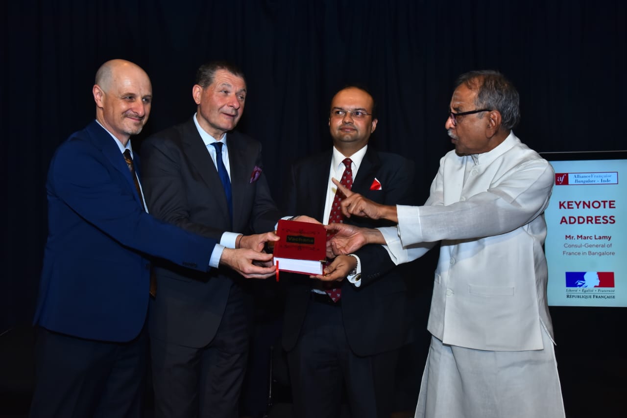 ಬುಧವಾರ ಅಲೈಯನ್ಸ್ ಫ್ರಾಂಕೈಸ್ನಲ್ಲಿ ನಡೆದ "ವಚನಾಸ್ ಇನ್ ಫ್ರೆಂಚ್" ಪುಸ್ತಕ ಬಿಡುಗಡೆ ಸಮಾರಂಭದಲ್ಲಿ ಬೆಂಗಳೂರಿನ ಫ್ರಾನ್ಸ್ ಕಾನ್ಸುಲ್ ಜನರಲ್ ಮಾರ್ಕ್ ಲ್ಯಾಮಿ (ಎಡದಿಂದ ಎರಡನೇ), ಬಸವ ಸಮಿತಿಯ ಅಧ್ಯಕ್ಷ ಶ್ರೀ ಅರವಿಂದ್ ಜಟ್ಟಿ (ಬಲಕ್ಕೆ ಕೊನೆಯ), ಅಲೈಯನ್ಸ್ ಫ್ರಾಂಕೈಸ್ ಅಧ್ಯಕ್ಷ ಡಾ. ಚಿನ್ಮಯ ಚಿಗಟೇರಿ (ಬಲಕ್ಕೆ ಕೊನೆಯಲ್ಲಿ) ಮತ್ತು ಅಲೈಯನ್ಸ್ ಫ್ರಾಂಕೈಸ್ ನಿರ್ದೇಶಕ ಜೀನ್ ಮಾರ್ಕ್ (ಎಡಕ್ಕೆ ಕೊನೆಯಲ್ಲಿ).